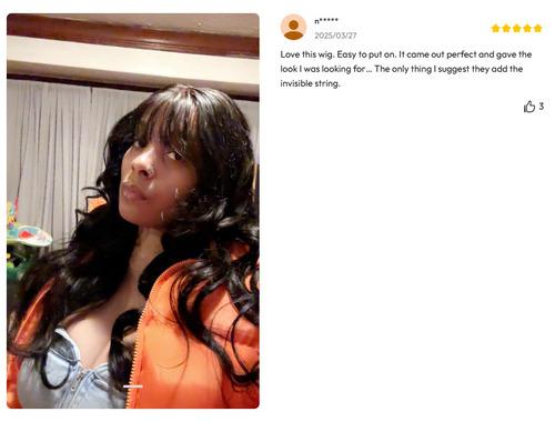 💬 "Love this wig. Easy to put on. It came out perfect and gave the look I was looking for… The only thing I suggest they add the invisible string."