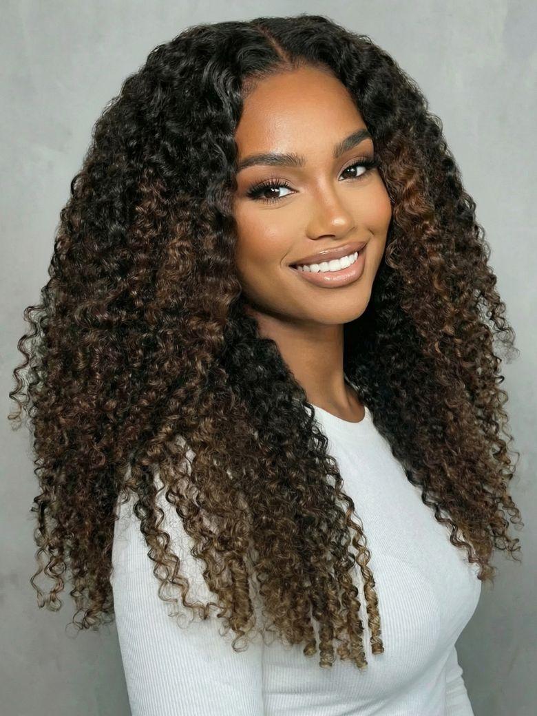 [From 18 Inch] EasiContour™ V Part Black to Chestnut Brown Jerry Curly Drawstring Wig 150% Density Protect Your Natural Hair