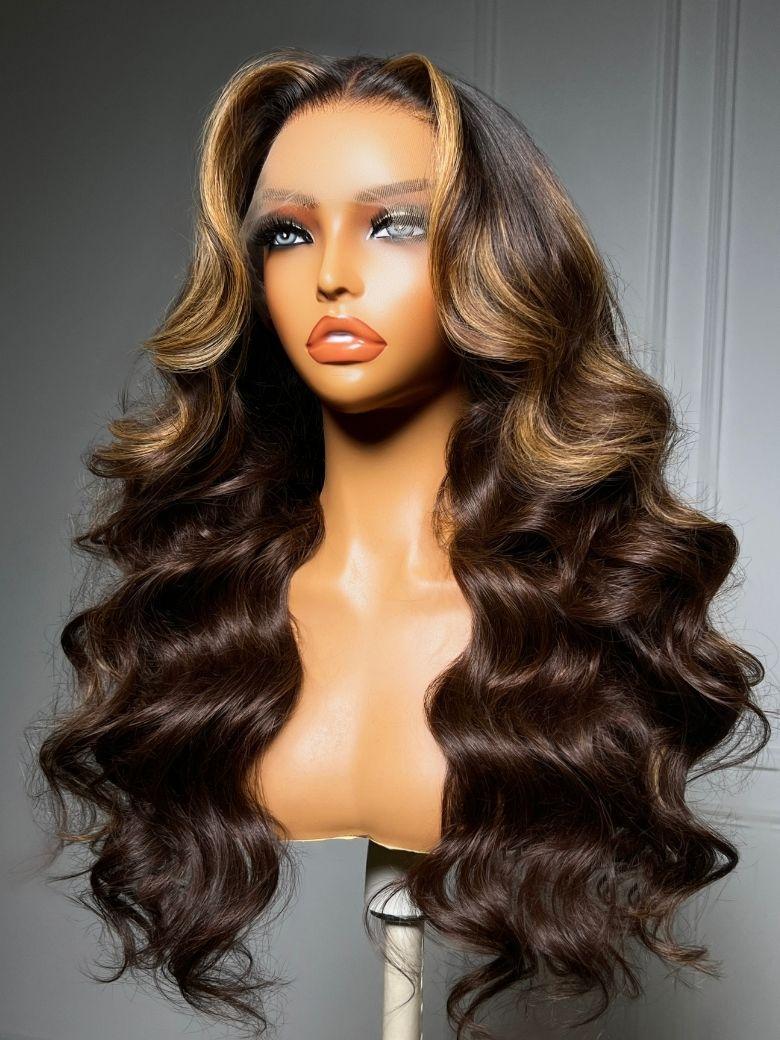 UNice 360 HD Lace Pre-plucked Luxury Raw Virgin Hair Chocolate Brown Balayage Body Wave Wig with Money Piece Highlights
