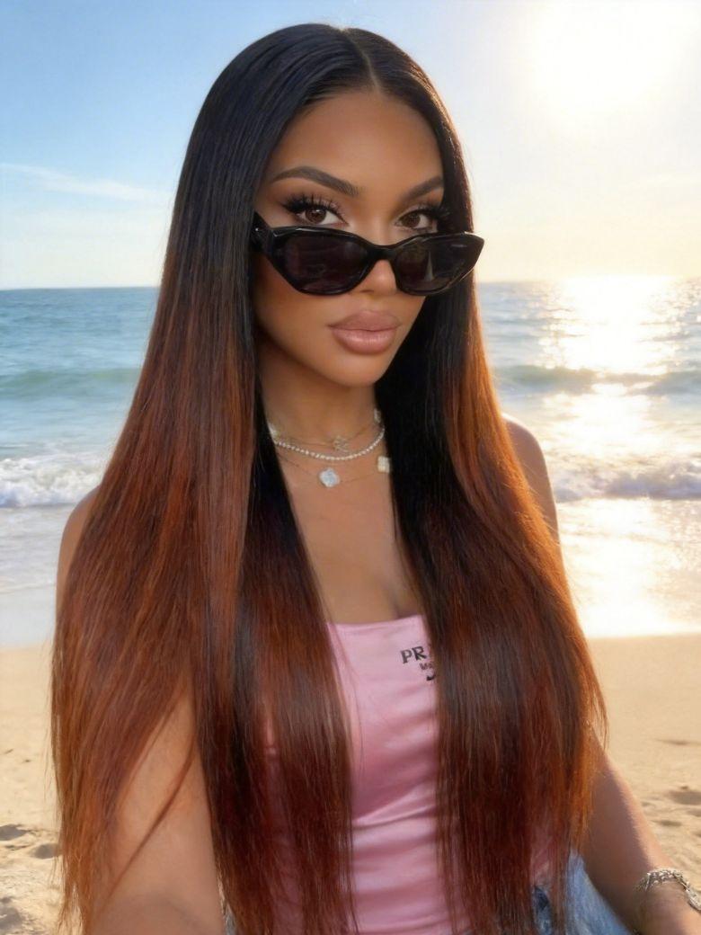 [18 Inch =$59] UNice EasiContour™ V Part Black to Reddish Brown Ombre Yaki Straight Wig