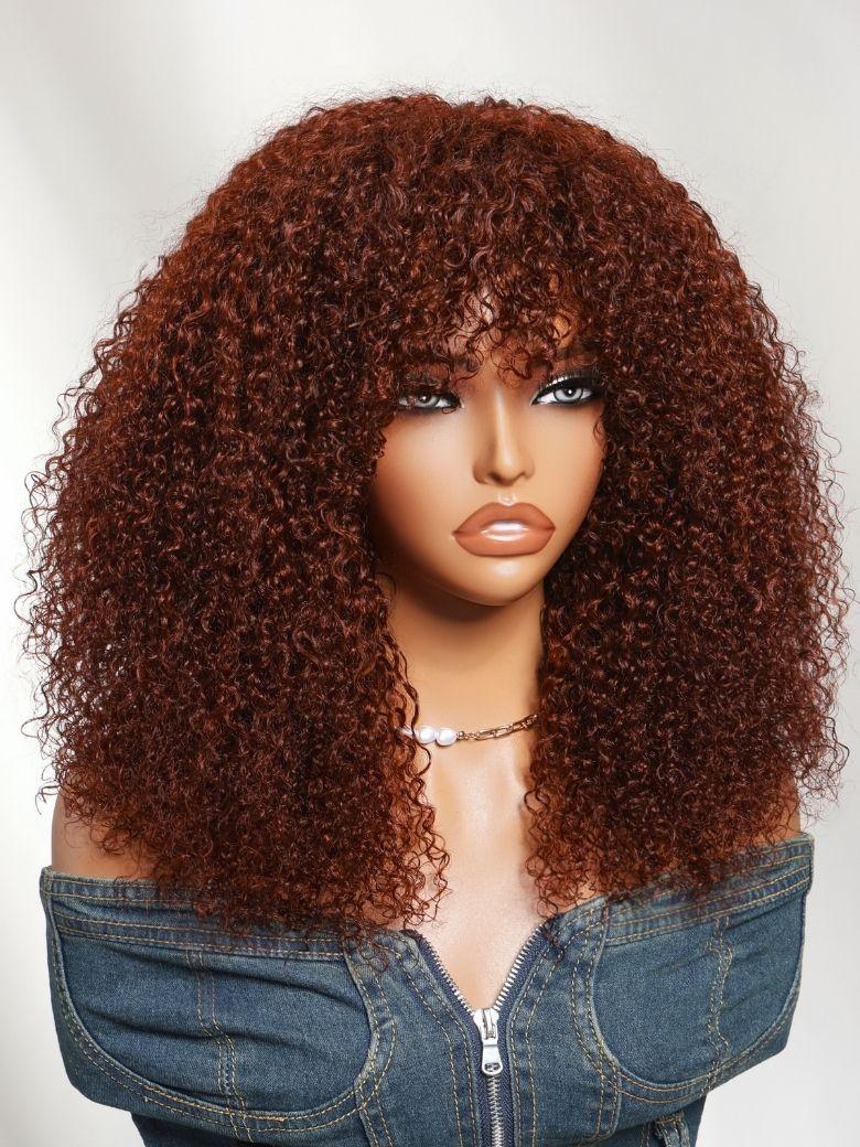 UNice Machine Made Reddish Brown Afro Kinky Curly Human Hair Glueless Wig with Bangs